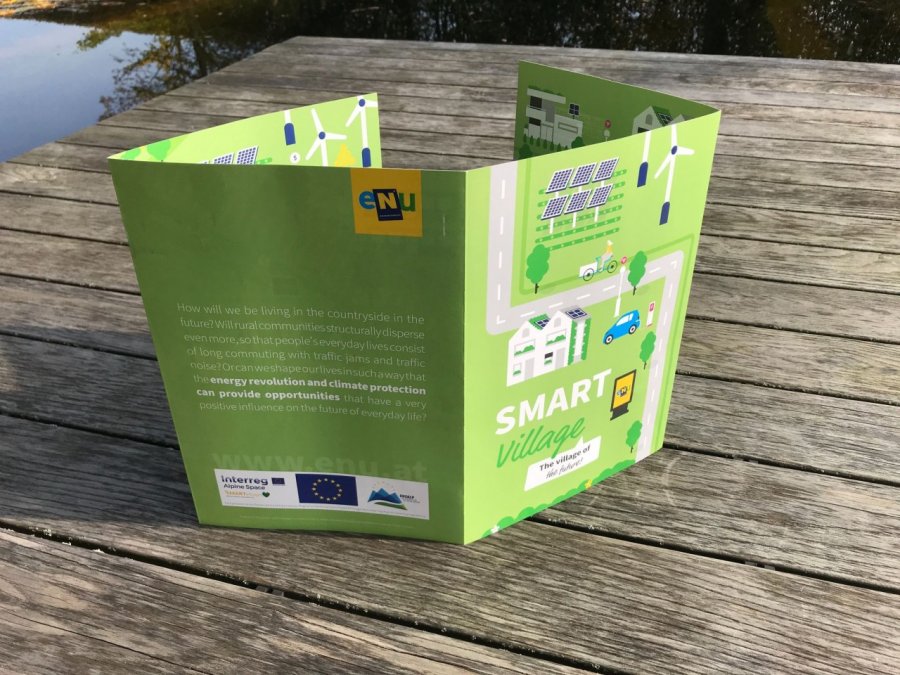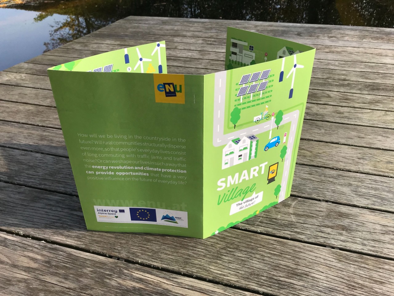 Zentrales Element dieses Folders ist die Illustration eines „Smart Villages“, wobei besonderes Augenmerk auf die fünf Schwerpunktthemen gelegt wurde: